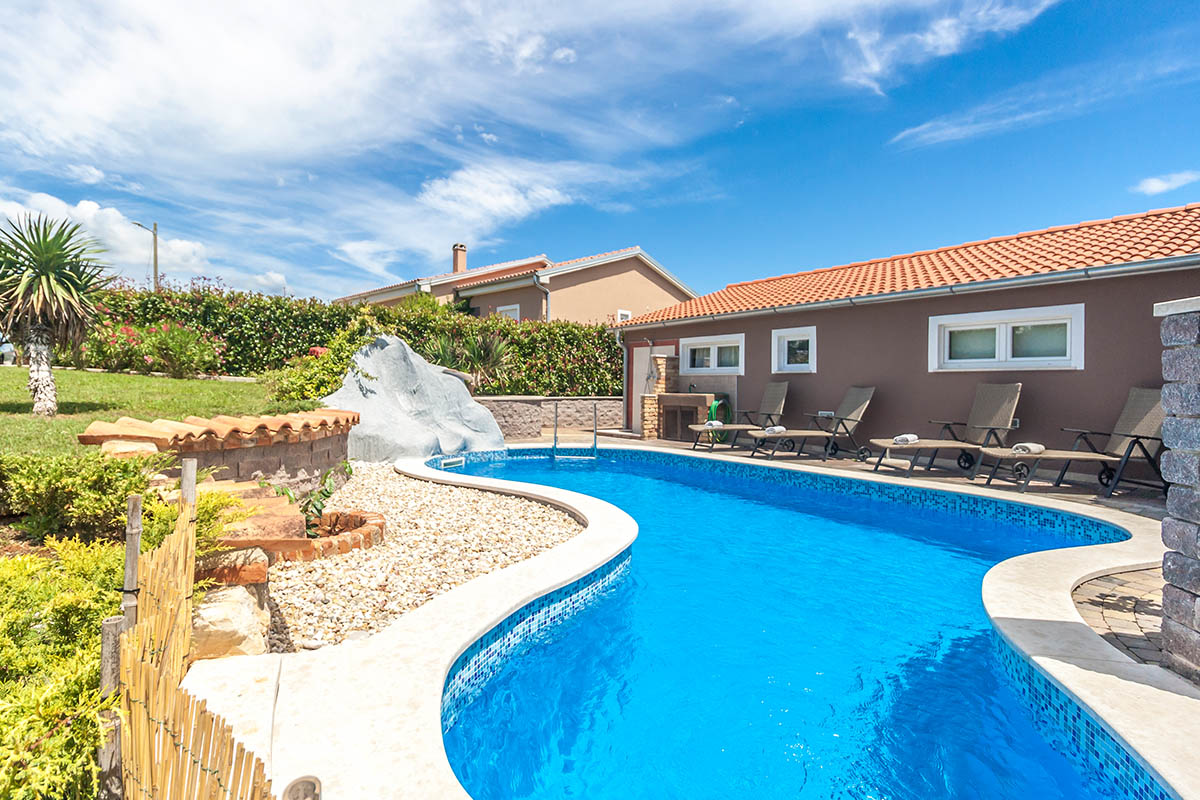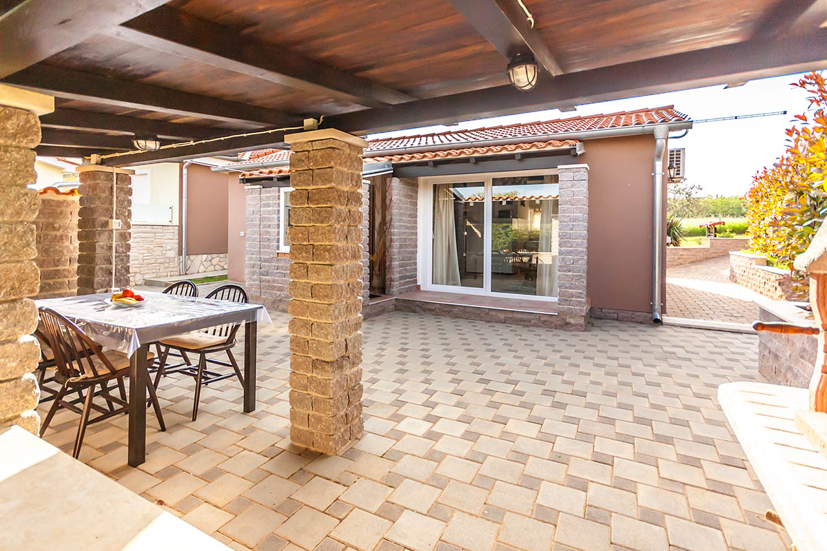 Cozy holiday house with a garden, terrace, BBQ, with irregular shaped private pool with about 30 m² surface area with a small waterfall, in a quiet location not far from Pula. Its 65 m² provide all the necessary modern comforts and conveniences, with a functional design for 4 people. It has two bedrooms, with a double bed in the first and a two single beds in the second. It has one bathroom with a shower, WC and washing machine. One extra person (child) can sleep in the living room on a sofa bed.