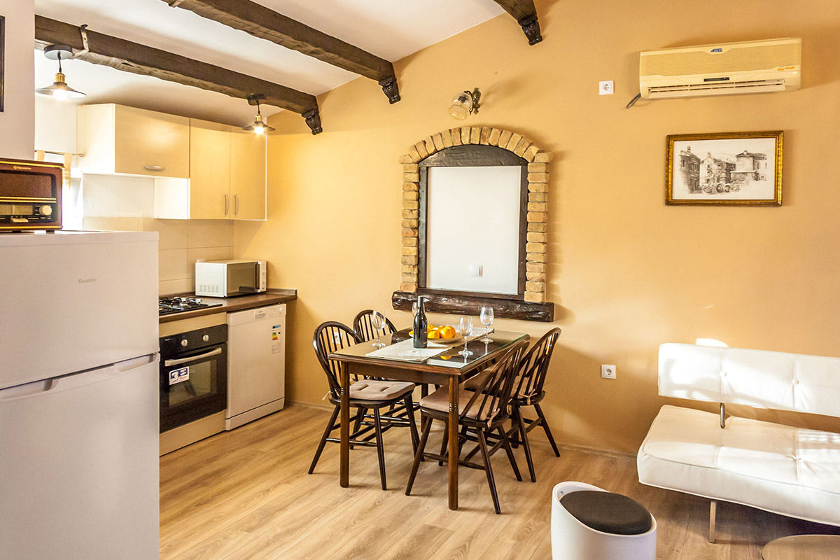 It has two bedrooms, with a double bed in the first and a two single beds in the second. It has one bathroom with a shower, WC and washing machine. One extra person (child) can sleep in the living room on a sofa bed. The open plan, air conditioned living room gets plenty of light through the large windows looking at the terrace inn front of the house. It consists of a sitting area with a sofa landscape in front of the TV, a dining area with table, and an open kitchen, fully-equipped with all modern appliances. Wireless Internet access is available.